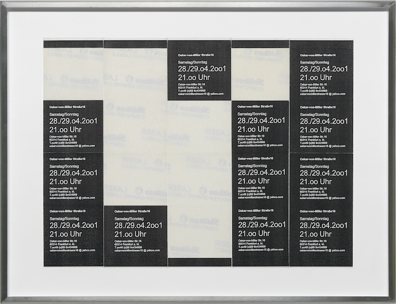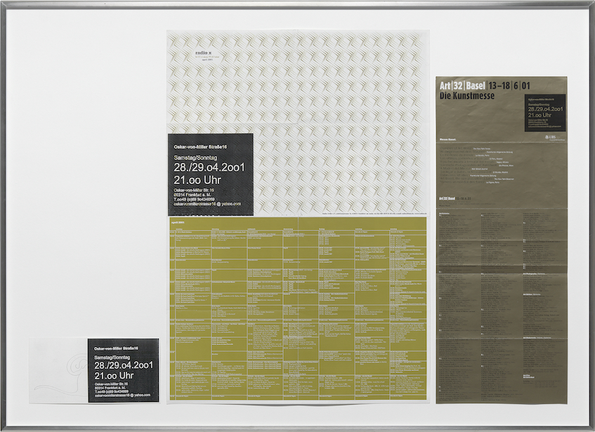 OSKAR-VON-MILLER STRASSE 16, an art space founded 2000 in Frankfurt M. by Michael Riedel and Dennis Loesch, became renowned as a gigantic replication device. With the call of ‚RECORD – LABEL – PLAY BACK,’ a group of young artists reiterated the language of a city’s cultural offerings— often without a full understanding of what they were reciting, but always with an acute aesthetic interest in the faults of transmission and transference.