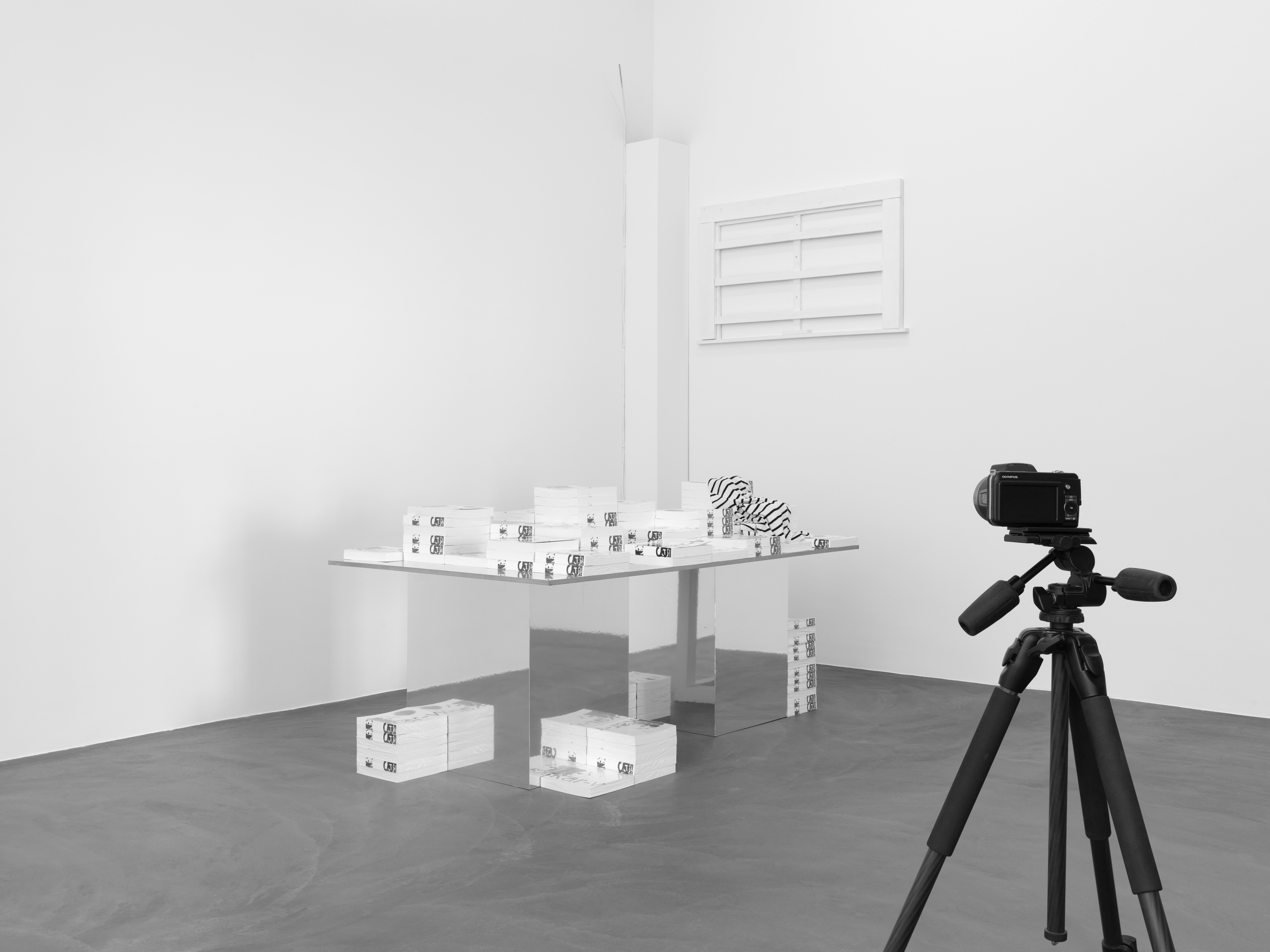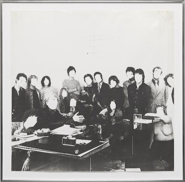 WARHOL SHOOTING (INSTALLATION), 2001/2014 – In the form of two so-called Conferences of Anecdotes, the book Oskar replays the repeated story of Oskar-von-Miller Strasse 16 (2000 to 2001). A replica of the rooms of Warhol’s second Factory (as pictured in Cecil Beaton’s photo ‘Andy Warhol and the Members of the Factory’ taken in 1969) serves as a display for the book and had already provided the setting for a re-enacted group shot in 2001. Forming part of the installation is a camera, positioned to imitate almost identically Cecil Beaton’s perspective when the original shot was taken, that automatically takes pictures of exhibition visitors as they read from the book.