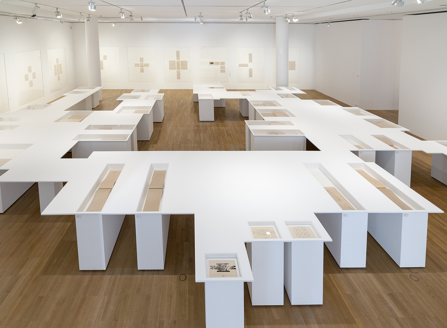 The work complex, which consists of nearly a thousand drawings in the form of 61 sheets, 36 wax books, numerous ancillary drawings and blank material, is a work synthesis that, composed of operations, offers the theoretical possibility of the endless drawing of drawings. With the signet as their starting point, the drawings are based on the interplay between a view from above and four respective views of the structural body. As a process of self-creation, the autopoeisis that takes place here consists in every view potentially being capable of being perceived as a view from above, from which further views can be drawn, which then, perceived as views from above, are the basis for new views, and so forth. The individual steps of the self-reproducing forms trigger an autodynamic process that confronts the viewers – of which the artist is one – with an overwhelming supply of forms.