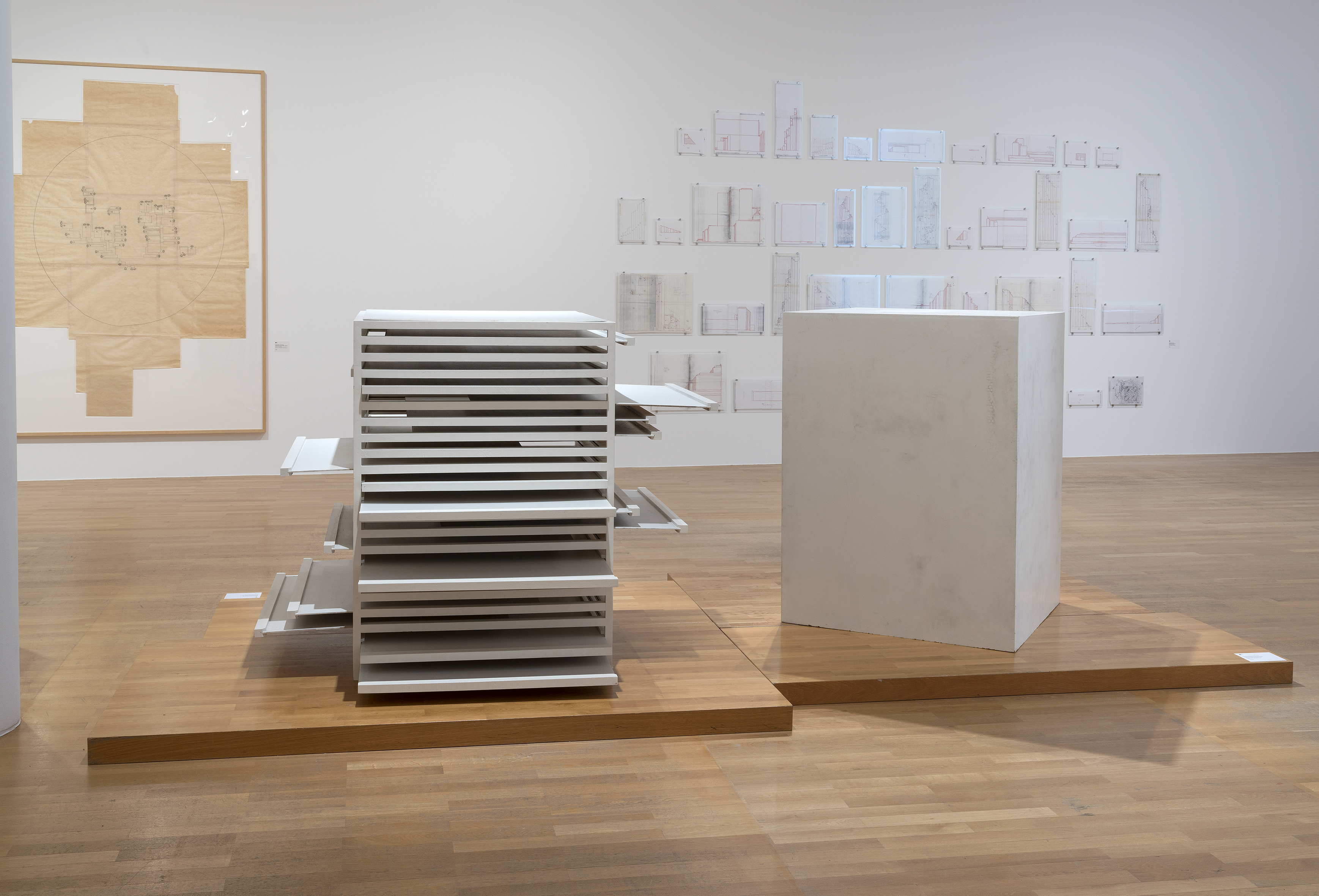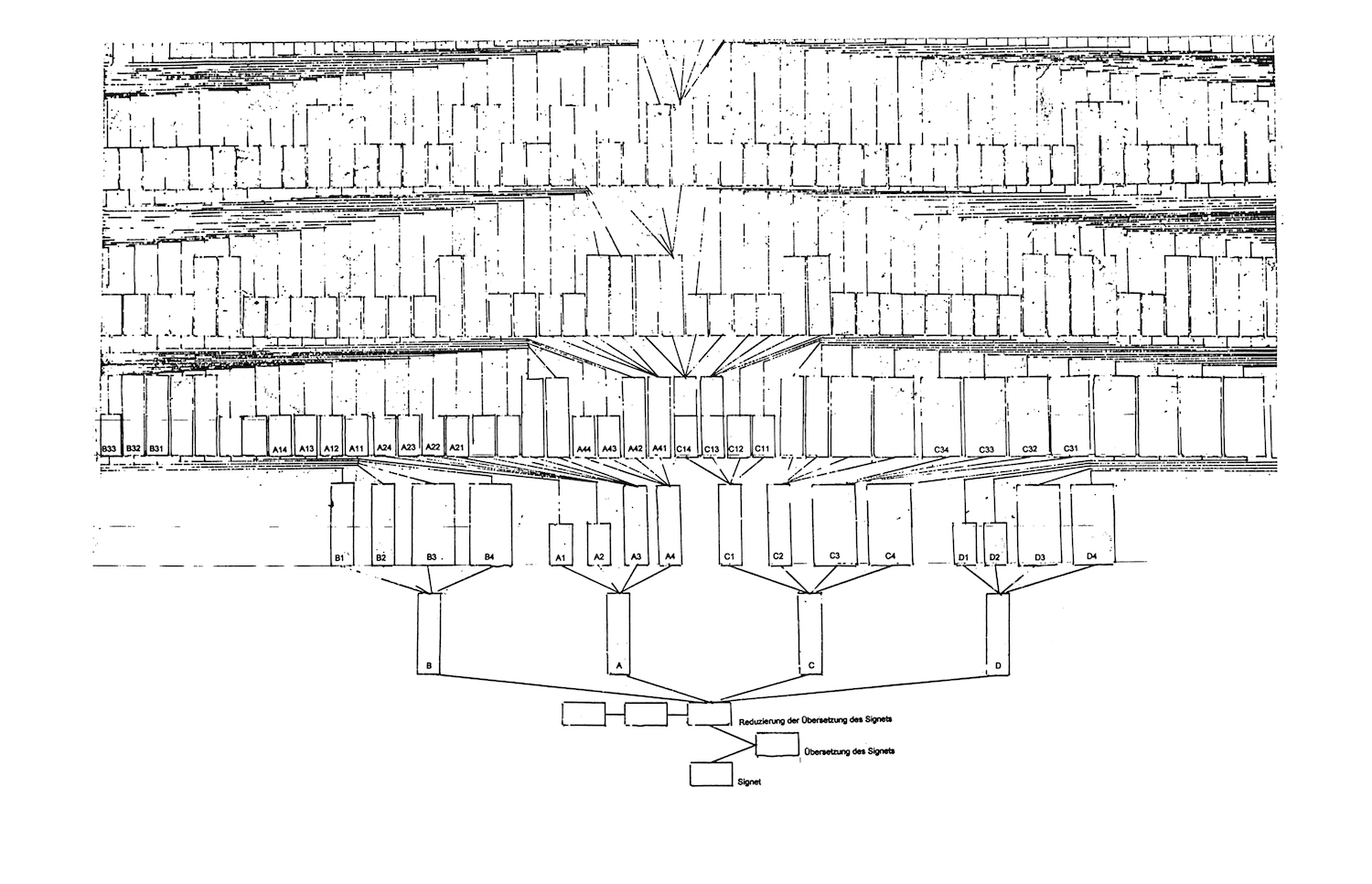 The work complex, which consists of nearly a thousand drawings in the form of 61 sheets, 36 wax books, numerous ancillary drawings and blank material, is a work synthesis that, composed of operations, offers the theoretical possibility of the endless drawing of drawings. With the signet as their starting point, the drawings are based on the interplay between a view from above and four respective views of the structural body. As a process of self-creation, the autopoeisis that takes place here consists in every view potentially being capable of being perceived as a view from above, from which further views can be drawn, which then, perceived as views from above, are the basis for new views, and so forth. The individual steps of the self-reproducing forms trigger an autodynamic process that confronts the viewers – of which the artist is one – with an overwhelming supply of forms.
